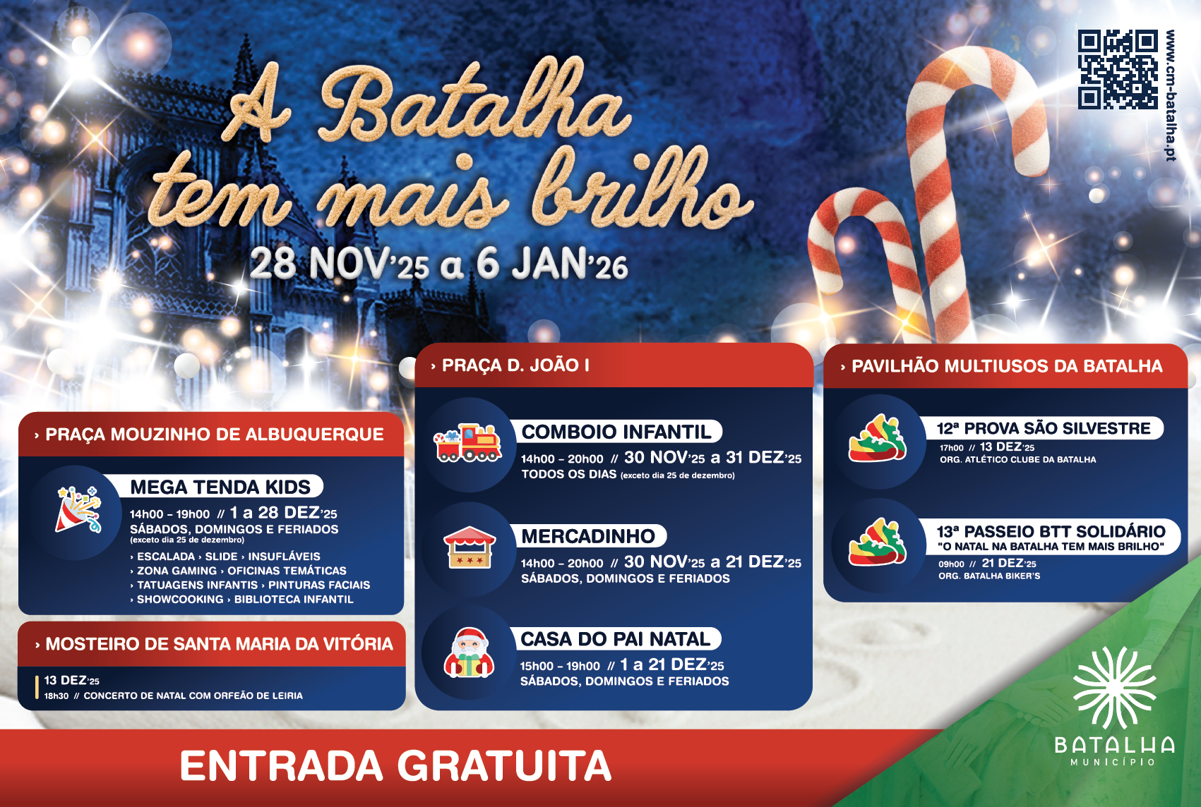 Com uma programação inteiramente gratuita e dedicada a promover o convívio, a criatividade e o espírito comunitário, “A Batalha tem mais brilho” pretende oferecer um Natal inesquecível às crianças e às famílias, valorizando o comércio local, reforçando a identidade cultural do concelho e convidando todos a viver a magia desta época na vila da Batalha.